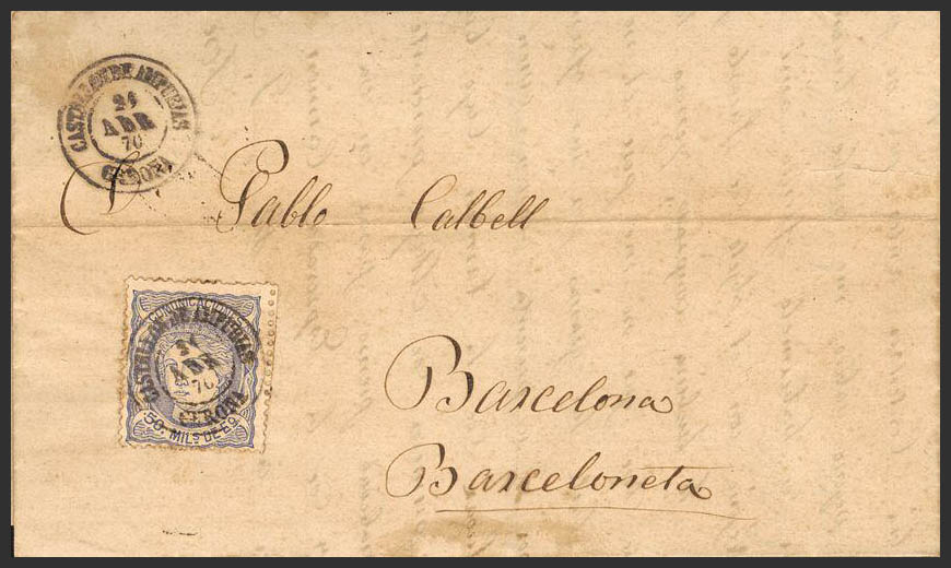107. 1870. 50 mils blue. CASTELLON DE AMPURIAS to BARCELONA. Postmark CASTELLON DE AMPURIAS / GERONA. MAGNIFICENT.