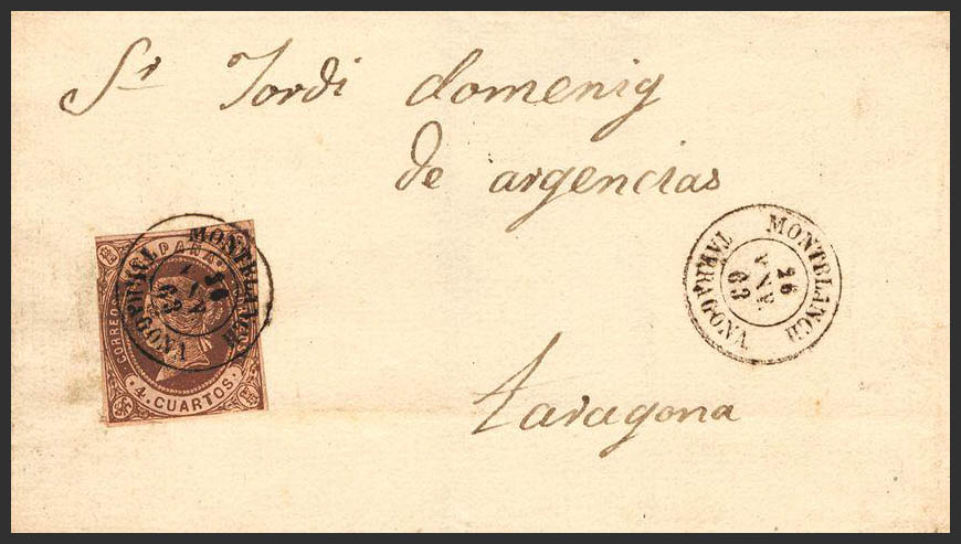 58. 1863. 4- cuartos chestnut. MONTBLANCH to TARRAGONA. Postmark MONTBLANCH / TARRAGONA. MAGNIFICENT.