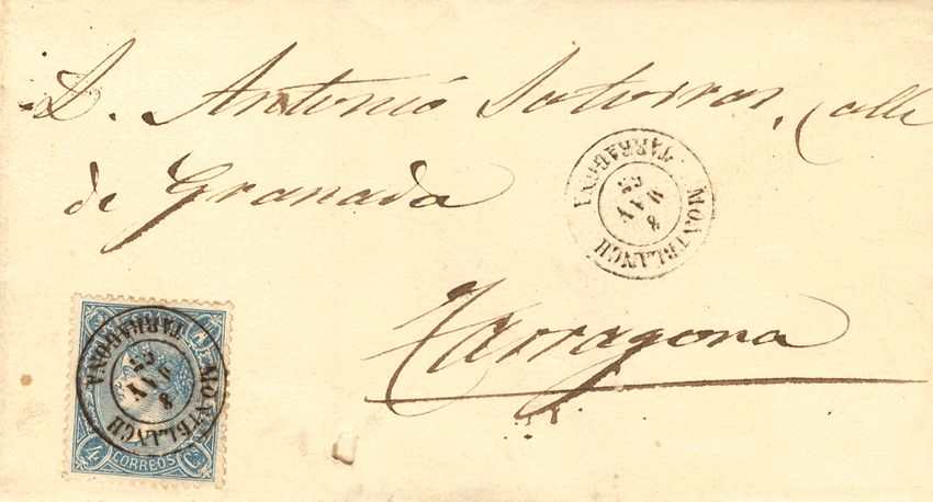 75. 1865. 4 cuartos blue. MONTBLANCH to TARRAGONA. Postmark MONTBLANCH / TARRAGONA. MAGNIFICENT.