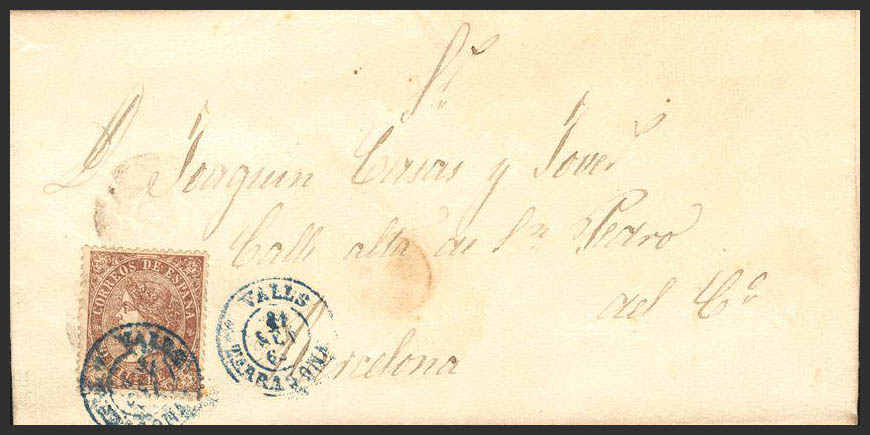 98. 1869. 50 mils lilac. VALLS to BARCELONA. Postmark VALLS / TARRAGONA, in blue. MAGNIFICENT AND RARE.