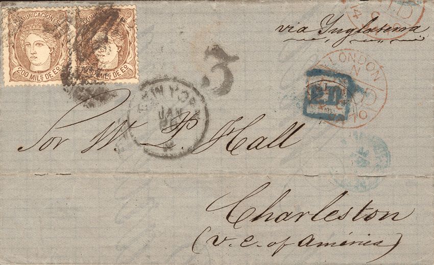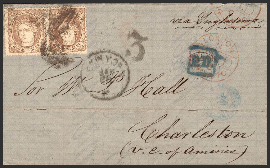 109(2). 1870. 200 mils, pair. BARCELONA to CHARLESTON (USA). MAGNIFICENT.
