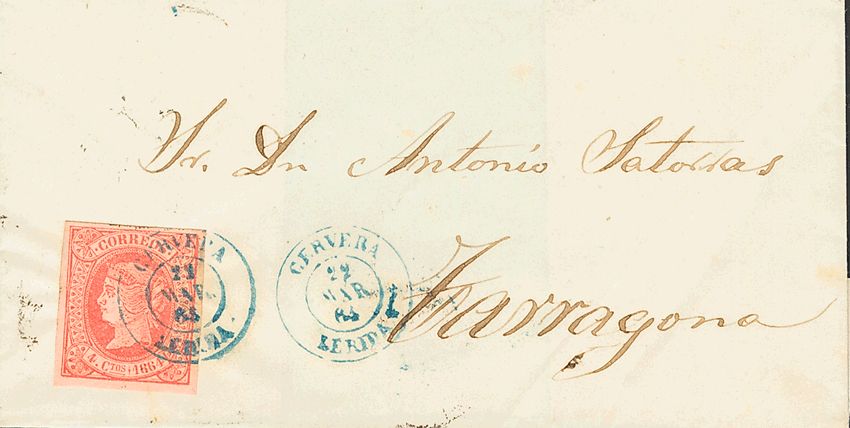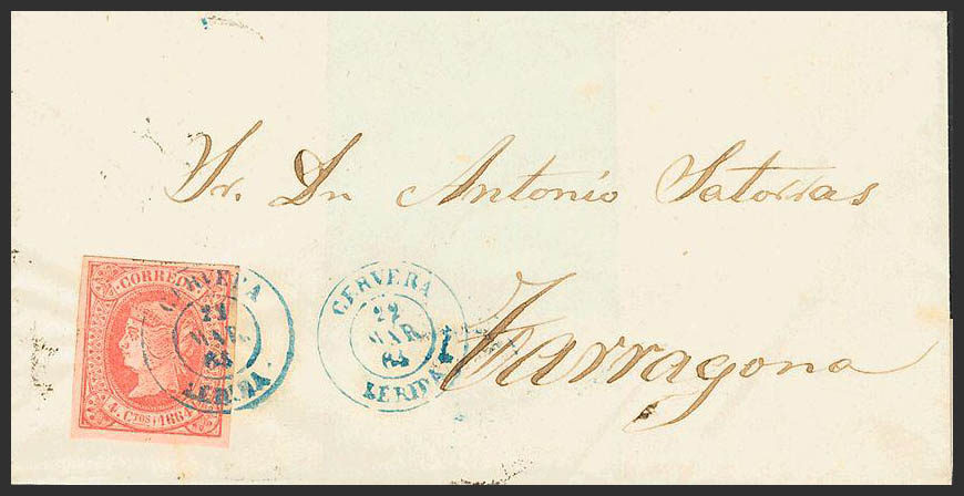 64. 1864. 4 cuartos pink. CERVERA to TARRAGONA. Postmark CERVERA / LERIDA, in blue. MAGNIFICENT AND RARE.