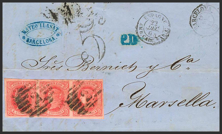64(3). 1864. 4 red cuartos , strip of three. BARCELONA to MARSEILLE (FRANCE). MAGNIFICENT AND UNUSUAL COMBINATION OF POSTAGE TO COMPLETE THE RATE OF 12 ROOMS.