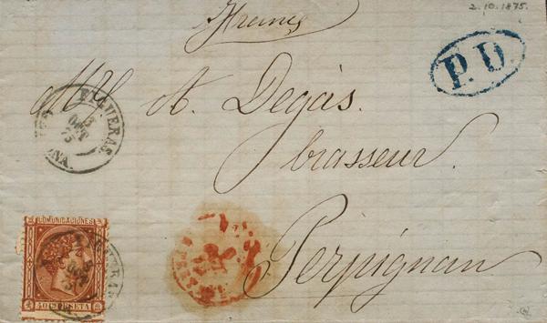 167. 1875. 40 chestnut cts. FIGUERAS to PERPIÑAN (FRANCE). Postmark FIGUERAS / GERONA. MAGNIFICENT AND RARE, CIRCULATED WITH EXCESS POSTAGE AS THE NEW RATE OF 25 CTS IS NOW IN FORCE. Ex-Blight.