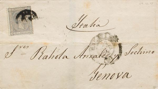 174, 175(2). 1877. 5 cts chestnut and 10 cts blue, two stamps. REUS to GENOA (ITALY). Postmark WHEEL OF REUS. MAGNIFICENT AND UNUSUAL COMBINATION TO COMPLETE THE SINGLE POSTAGE RATE OF 25 CTS TO ITALY, ALSO THE ONLY KNOWN WITH THE SPECIAL POSTMARK OF REUS AND DESTINED ABROAD.