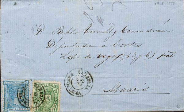 164, 154. 1876. 10 cts blue (file fold) and 5 cts green. PALAMOS to MADRID. Postmark PALAMOS / GERONA. BEAUTIFUL AND VERY RARE. Ex-Blight.