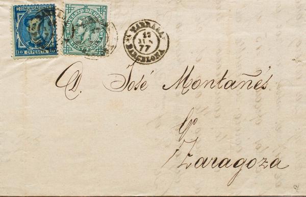 175, 183. 1877. 10 cts blue and 5 cts green. TARRASA to ZARAGOZA. Postmark TARRASA / ZARAGOZA. MAGNIFICENT. Ex-Blight.