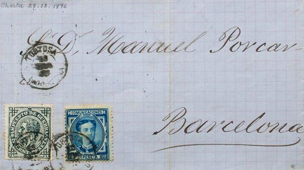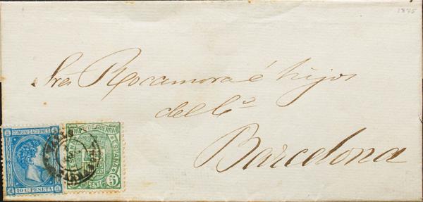 175, 183. 1876. 10 cts blue and 5 cts green. TORTOSA to BARCELONA. Postmark TORTOSA / TARRAGONA. MAGNIFICENT. Ex-Blight.
