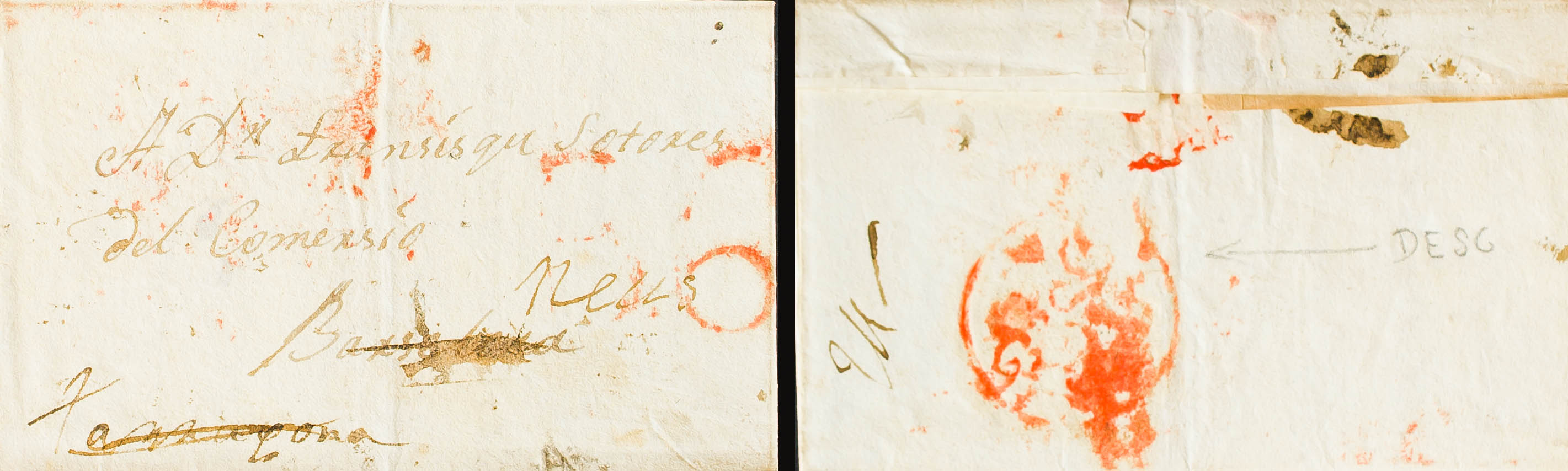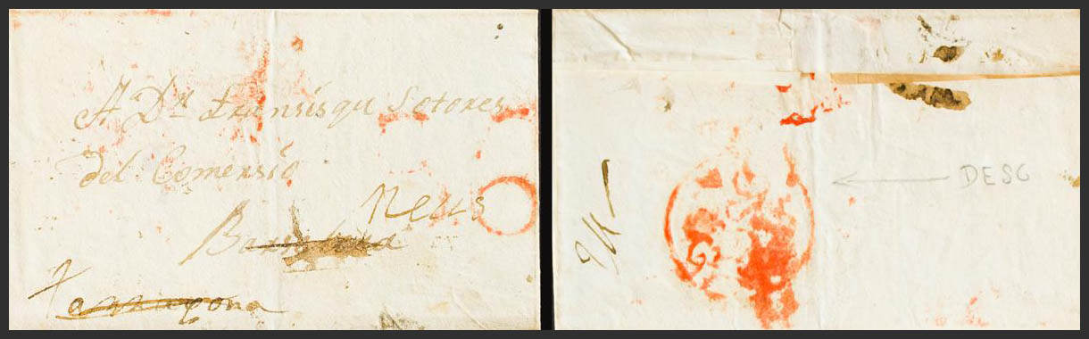 1820. REUS to BARCELONA, forwarded to TARRAGONA and returned to sender. DESC mark, in red and on the back (PE76) 2004 edition. PRETTY AND VERY RARE.