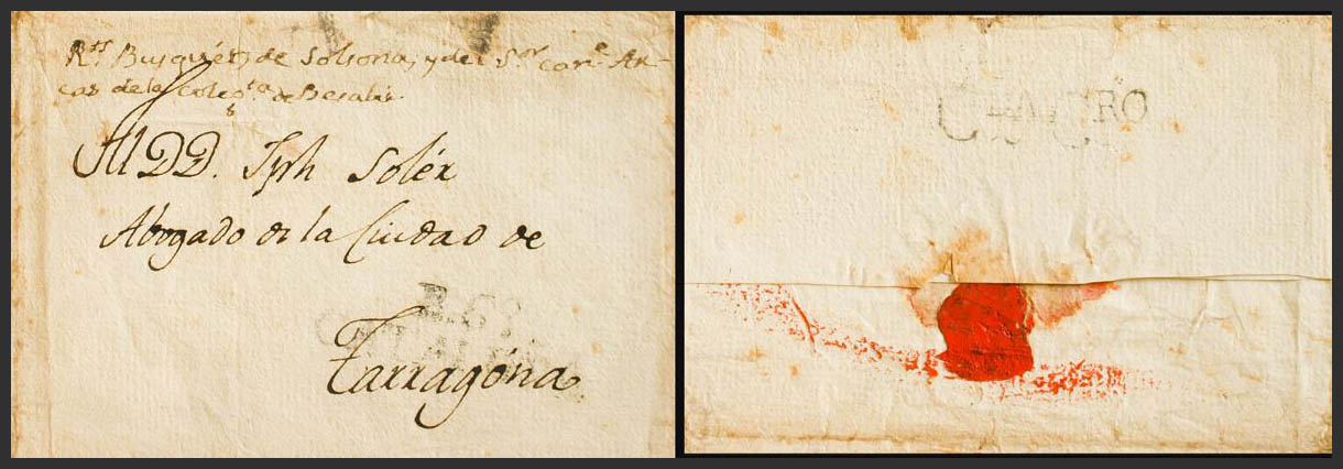 (1806ca). BESALU to TARRAGONA. Mark B. 6º / CATALUÑA, in black (PE1) 2004 edition and CDA arrival mark on the back. CRO, from Tarragona and which, according to Tizón's work, means Cobrada Postman (PE24). MAGNIFICENT AND VERY RARE COMBINATION OF BRANDS, PROBABLY THE ONLY KNOWN.