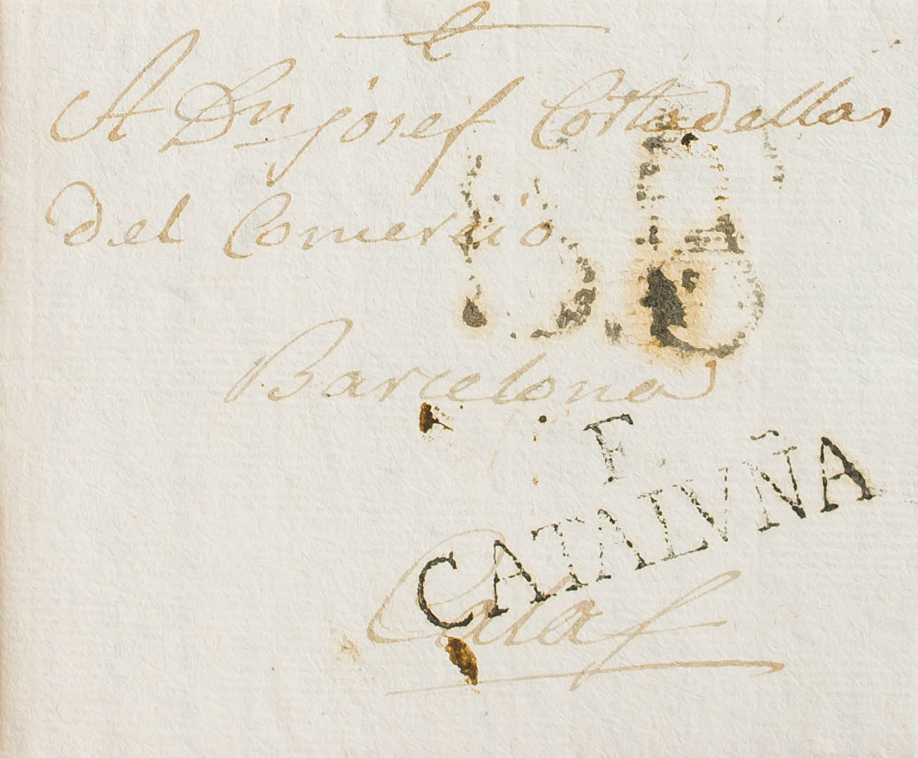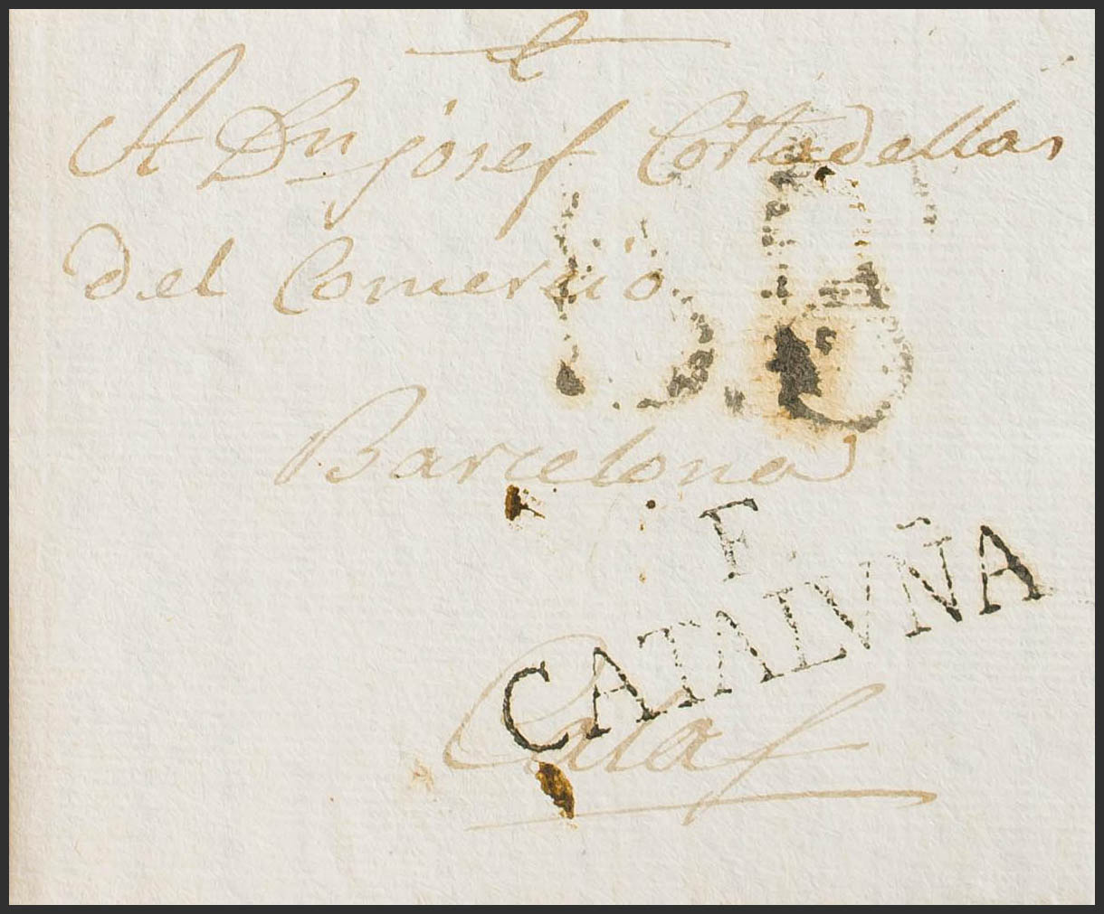 English 1802. CASTELLON DE AMPURIAS in CALAF. Brand F. / CATALVÑA, in black from Figueras (PE14) 2004 edition. MAGNIFICENT STAMPING AND VERY RARE.