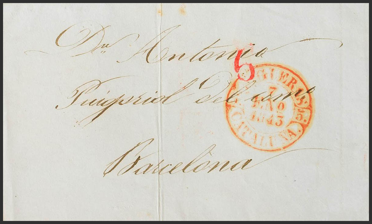 English 1843. FIGUERAS to BARCELONA. Baeza FIGUERAS / CATALONIA, in red. MAGNIFICENT PRINT.