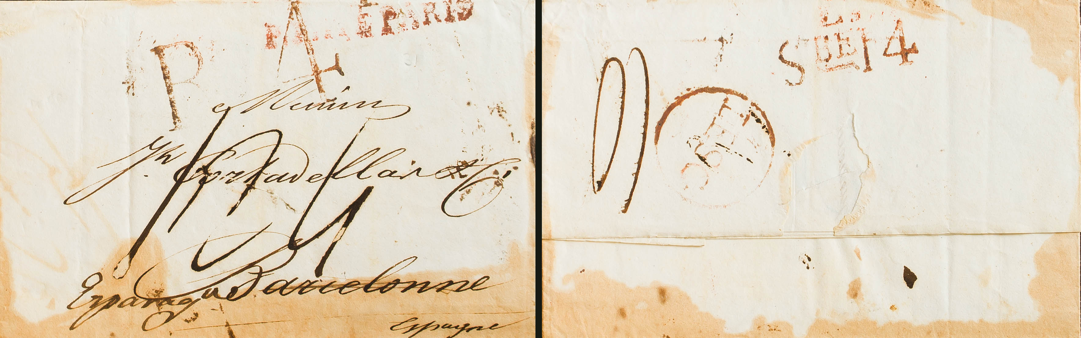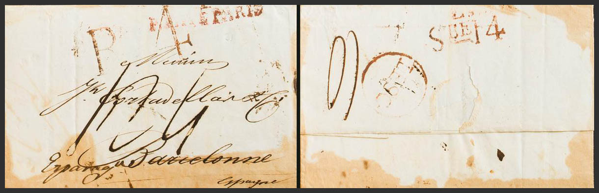1824. PARIS to BARCELONA (disinfected letter). Mark DESC on the back, in red (PE76) 2004 edition. MAGNIFICENT AND VERY RARE.