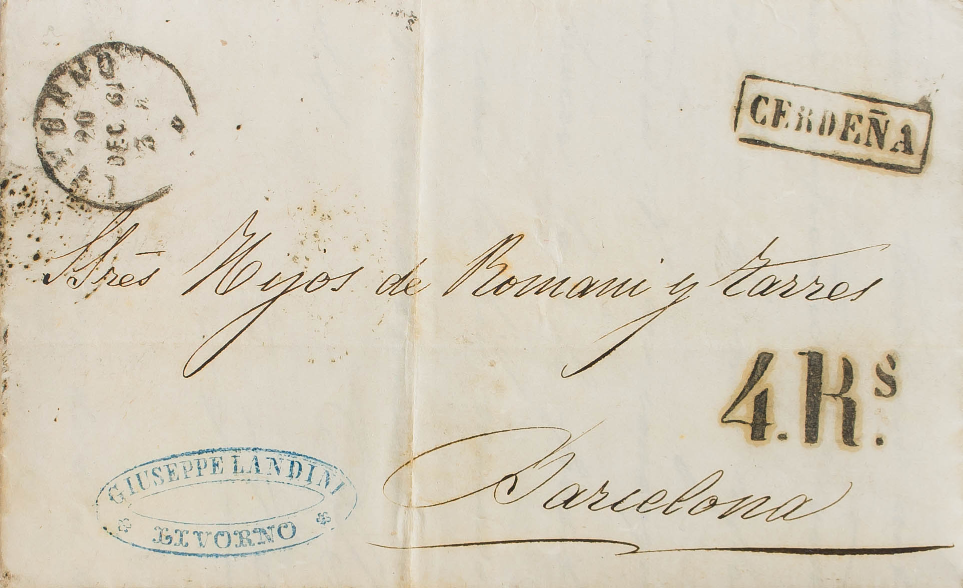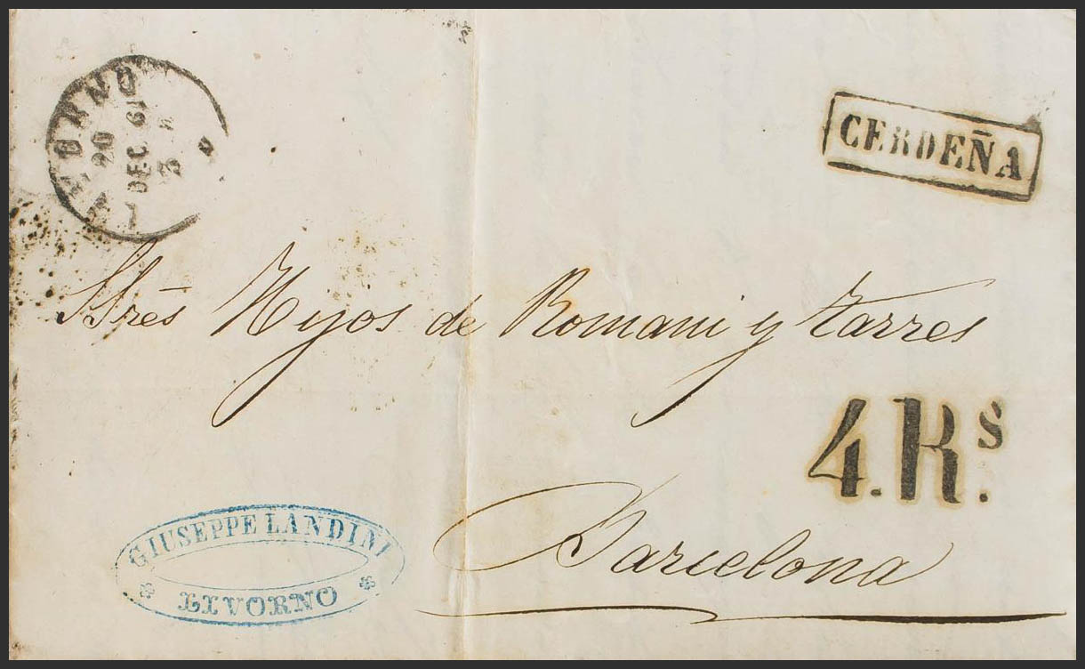 English 1861. LIVORNO (ITALY) to BARCELONA. CERDEÑA brand, in black from La Junquera applied to indicate the origin (PE8) 2004 edition. MAGNIFICENT.