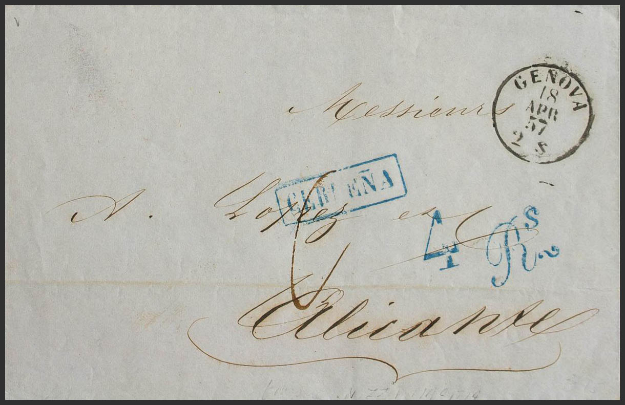 1857. GENOA to ALICANTE. CERDEÑA brand, in La Junquera blue, applied to indicate the origin (PE8) 2004 edition. MAGNIFICENT.