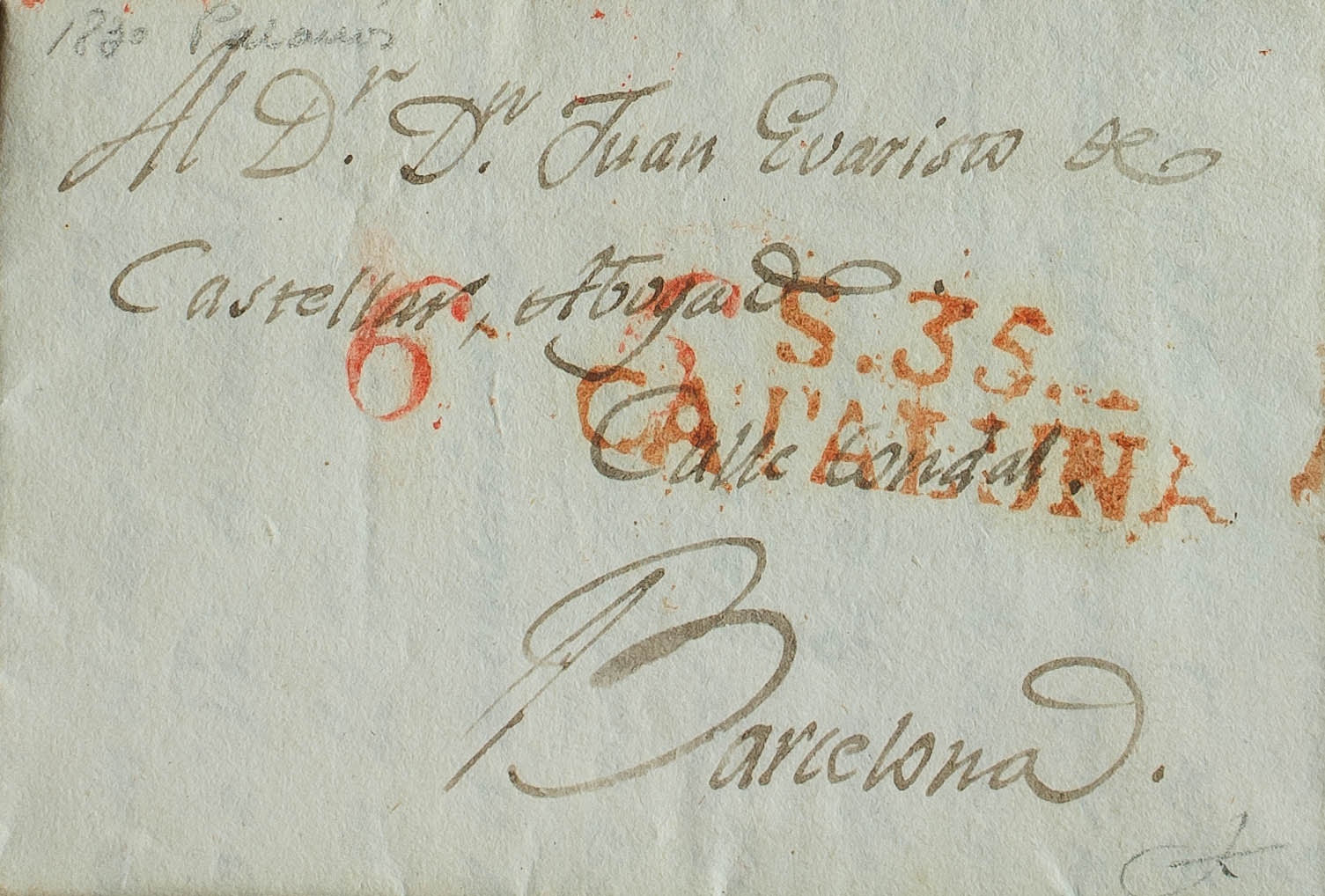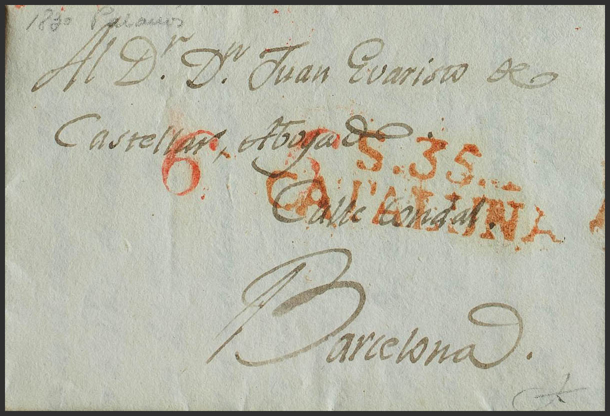 1830. PALAMOS (GERONA) to BARCELONA. Brand S.35 / CATALUÑA, in red from San Feliú de Guixols (PE3) 2004 edition. MAGNIFICENT.