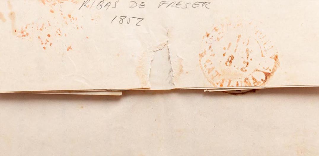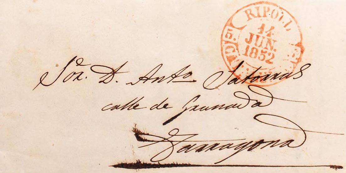 1852. RIBAS DE FRESER to TARRAGONA. Baeza RIPOLL / CATALUÑA, in red. MAGNIFICENT.