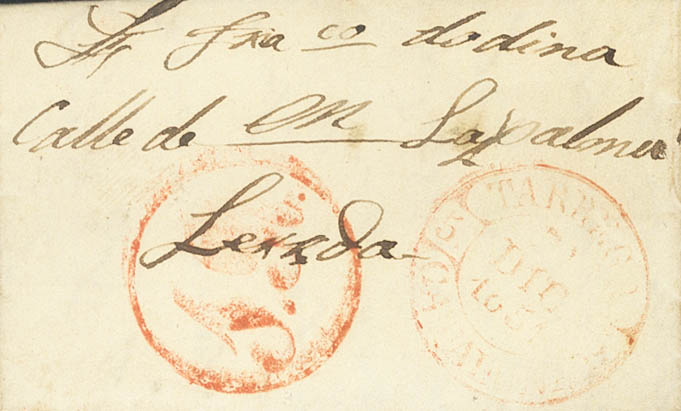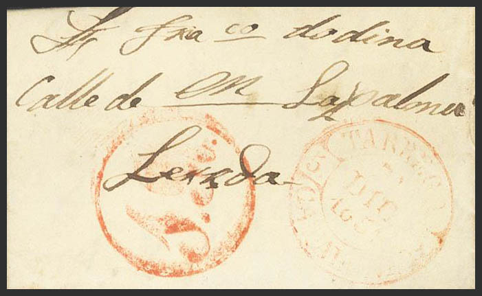 1855. TARREGA to LERIDA (complete reduced-size letter). Baeza TARREGA / CATALONIA, in red. MAGNIFICENT AND RARE IN THIS SIZE.