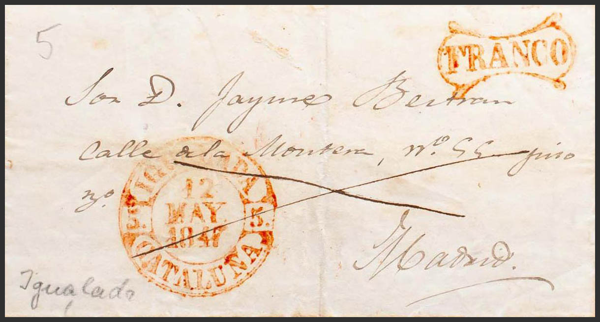 Catalonia. Pre-philately. IGUALADA / CATALUÑA and general use brand FRANCO. MAGNIFICENT AND RARE.