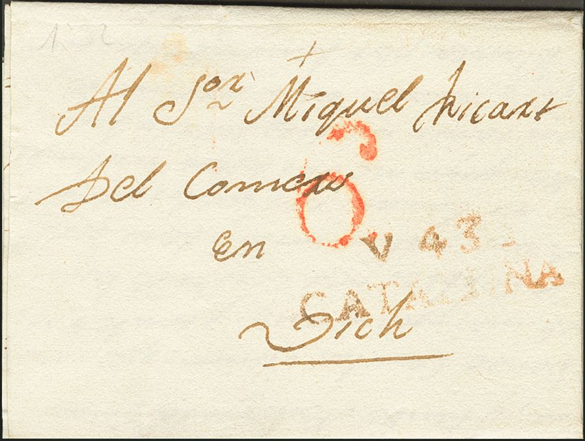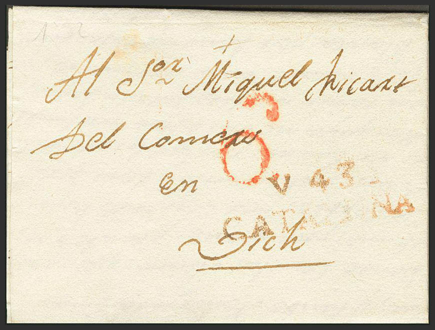 1832. VALLS to VICH. Mark V. 43 / CATALUÑA, in red (PE 4), on arrival. PRETTY.