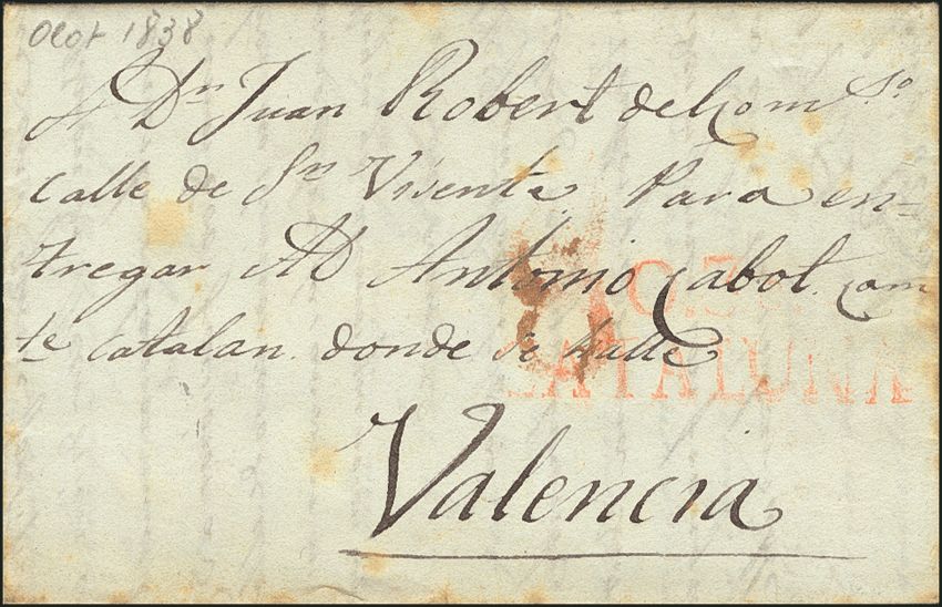 1838. OLOT to VALENCIA. Mark O.30 / CATALUÑA, in red (PE 5) 2004 edition. VERY RARE.