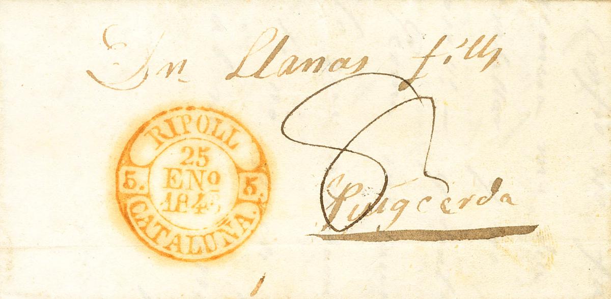 |ABOUT|1845. RIPOLL (GERONA) to PUIGCERDA. Baeza RIPOLL / CATALONIA, in red. MAGNIFICENT AND SPECTACULAR PRINTING.