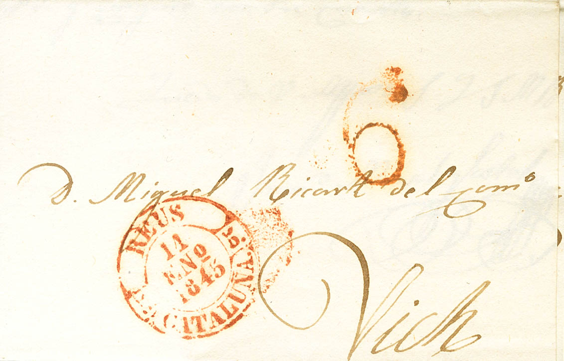 |ABOUT|1845. REUS (TARRAGONA) to VICH. Baeza REUS / CATALONIA, in red. MAGNIFICENT.