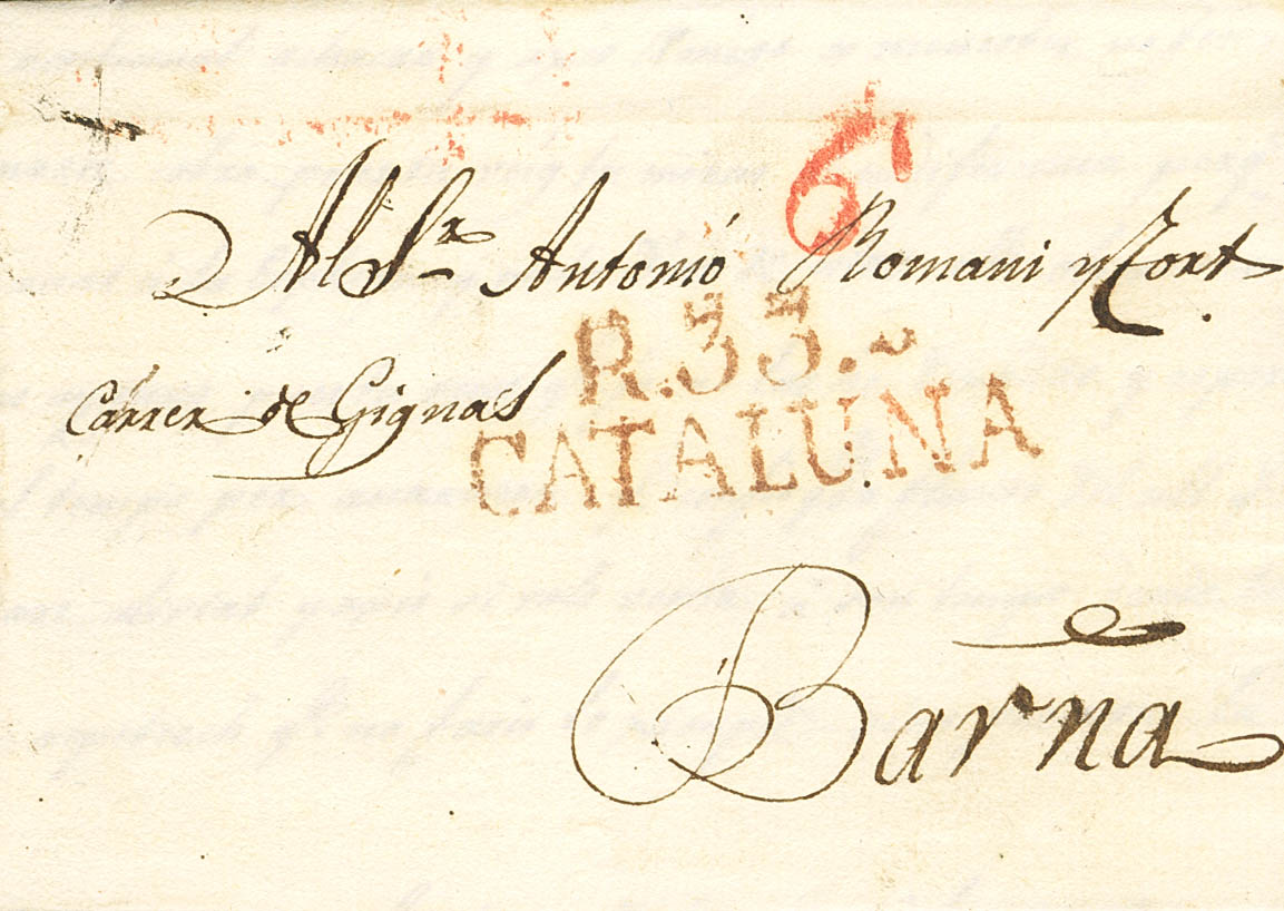 |ABOUT|1831. REUS to BAGoodELONA. Mark R.33 / CATALONIA, in red (PE9) 2004 edition. MAGNIFICENT.
