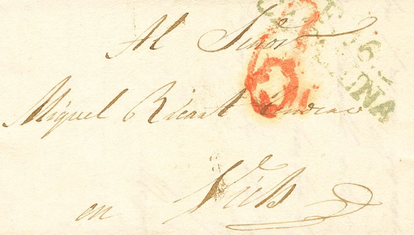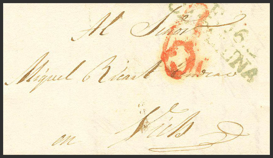 English 1832. FIGUERAS to VIELS. Mark F.16 / CATALUÑA, in green (PE15) 2004 edition. MAGNIFICENT AND RARE.