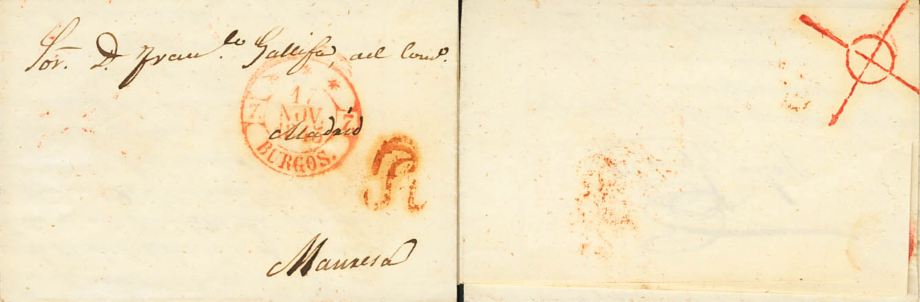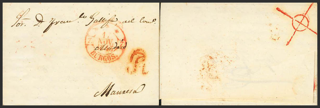 English 1845. BURGOS to MANRESA. Mark "R" stamped on arrival on the obverse (all known are on letters originating in Burgos) (PE19) 2004 edition, Barcelona transit mark (PE77) 2004 edition on the back. MAGNIFICENT AND VERY RARE, USED POSTMARKED ON THE 6 QUARTER OF 1850.