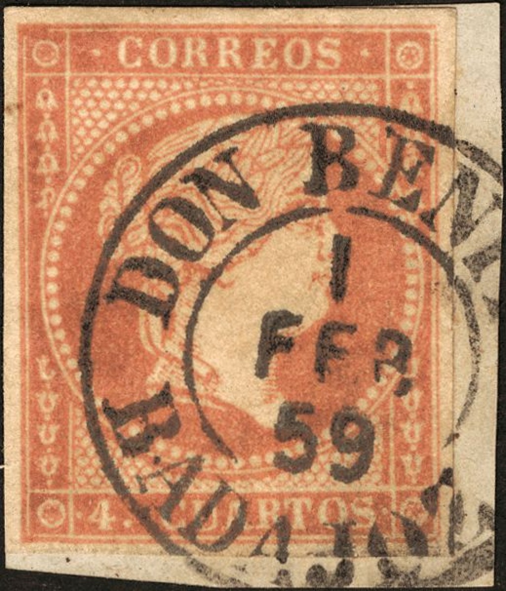 48. 1856. 4 red cuartos . Postmark DON BENITO / BADAJOZ (Type I). MAGNIFICENT.