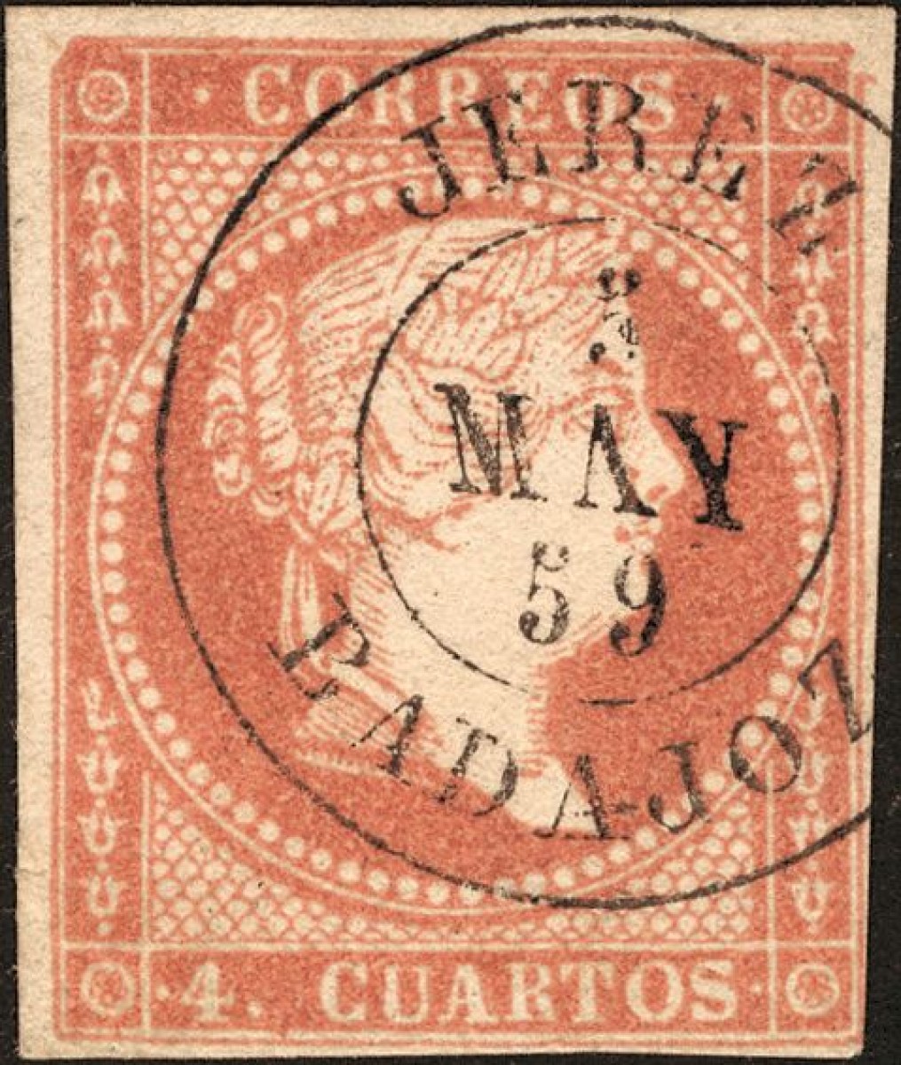 English 48. 1856. 4 red cuartos . Postmark JEREZ / BADAJOZ. MAGNIFICENT.
