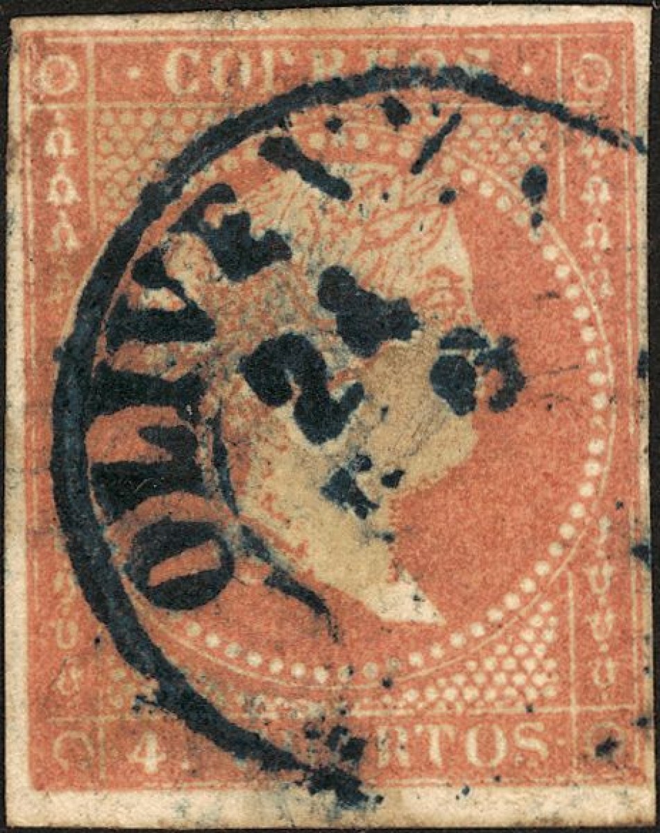 48. 1856. 4 red cuartos . Postmark OLIVENZA / BADAJOZ (Type I), in blue.