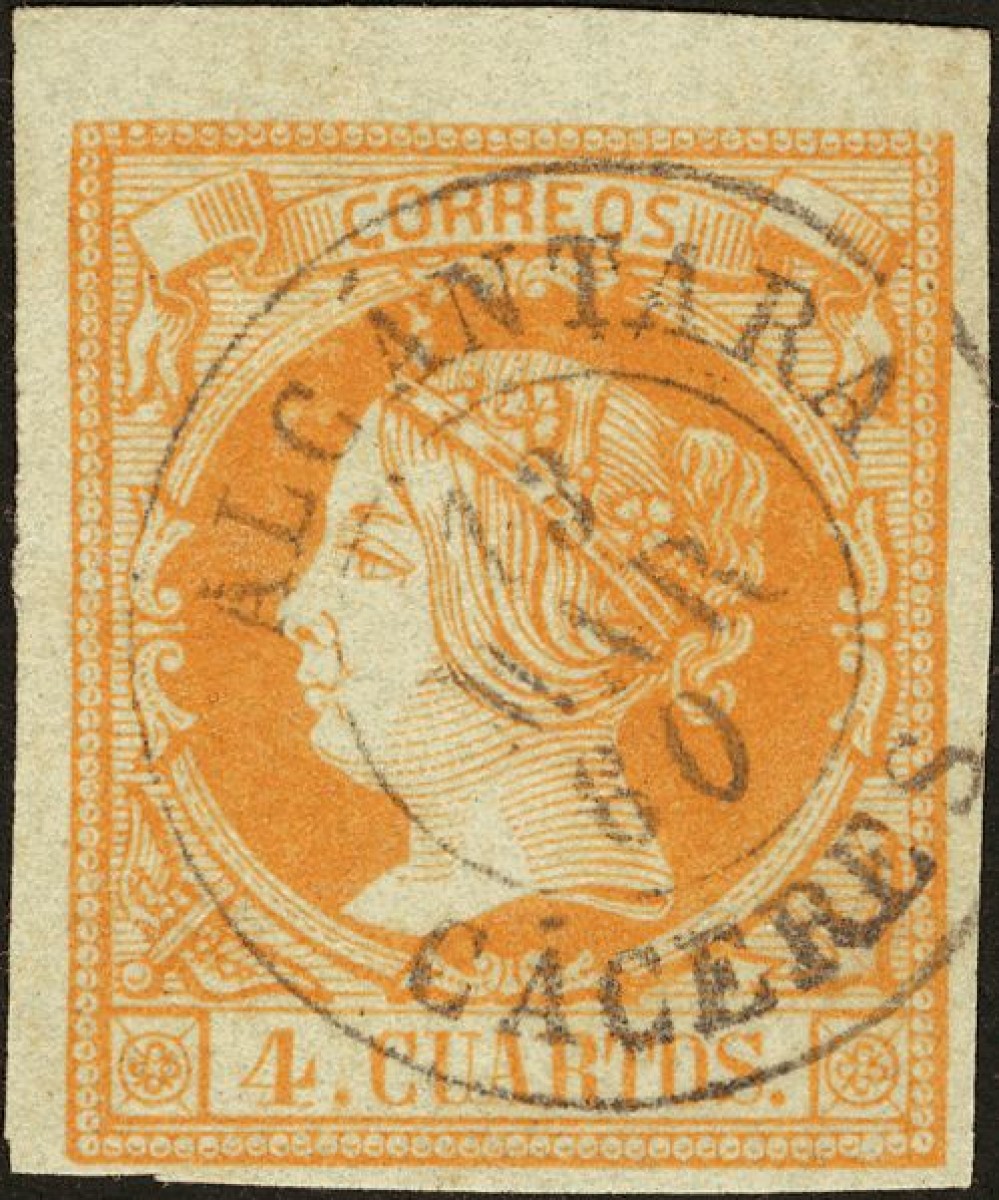 52. 1860. 4 cuartos yellow. Postmark ALCANTARA / CACERES. MAGNIFICENT.