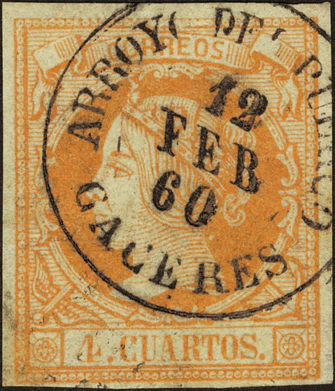 English 52. 1860. 4 cuartos yellow. Postmark ARROYO DEL PUERCO / CACERES.