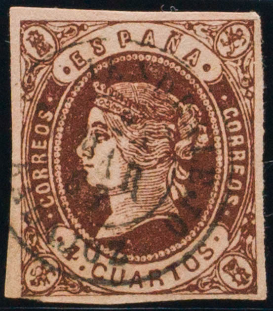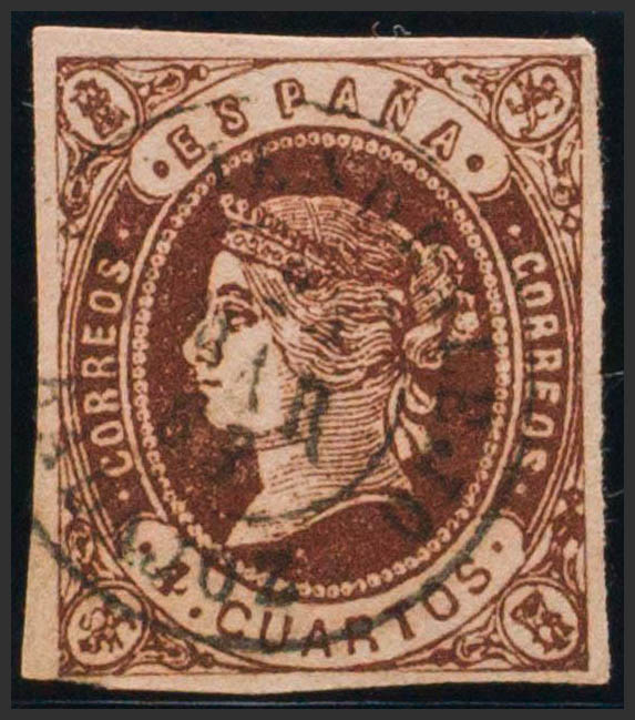 English 58. 1862. 4- cuartos chestnut. Postmark ALMENDRALEJO / BADAJOZ. MAGNIFICENT.