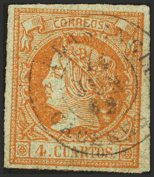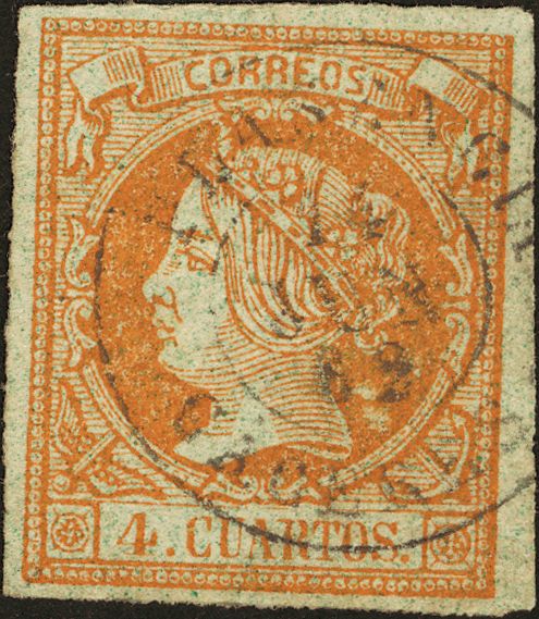 52. 1860. 4 cuartos yellow. Postmark PLASENCIA / CACERES. BARELY READABLE.