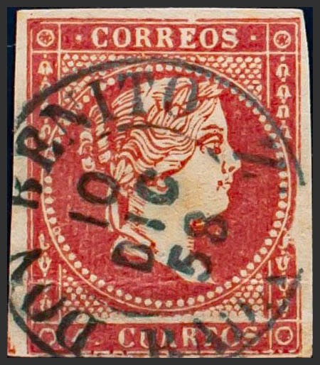 English 48. 1856. 4 cuartos red. Postmark DON BENITO / BADAJOZ (Type I), in blue. MAGNIFICENT AND RARE.