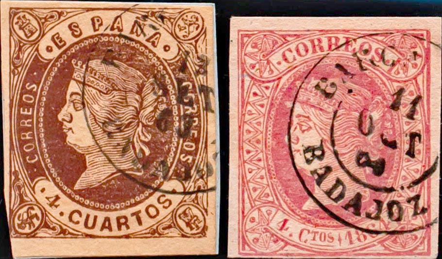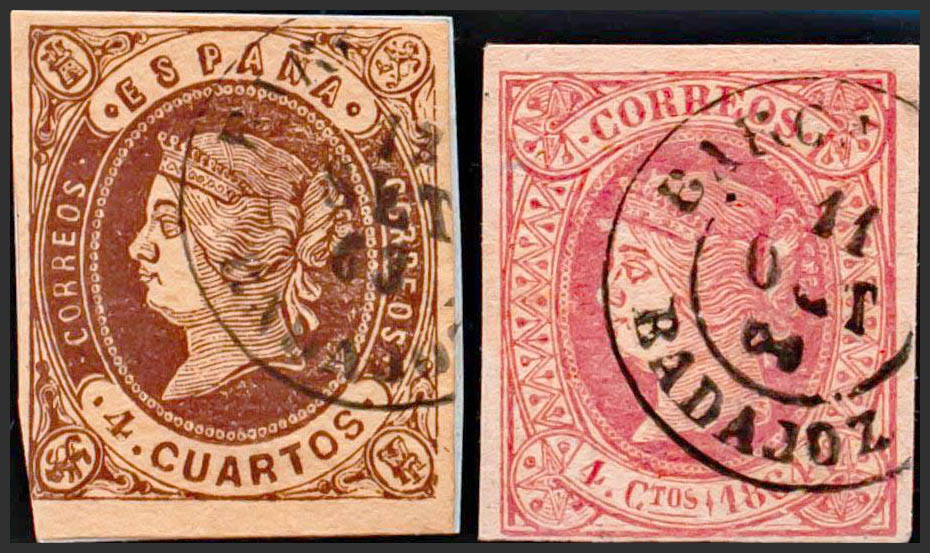 58, 64. (1862ca). Set of two stamps of 4 cuartos brown and 4 cuartos pink, unused with BARCARROTA / BADAJOZ postmark. MAGNIFICENT.