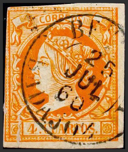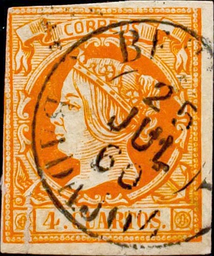 52. 1860. 4 orange cuartos . Postmark BERLANGA / BADAJOZ (Type I). MAGNIFICENT AND RARE.