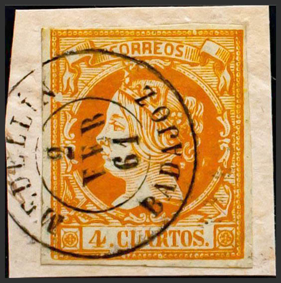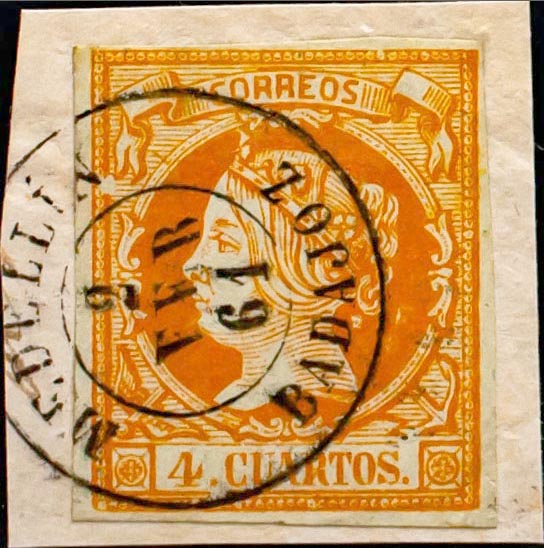 △ 52. 1860. 4 yellow cuartos , on fragment. Postmark MEDELLIN / BADAJOZ. MAGNIFICENT.