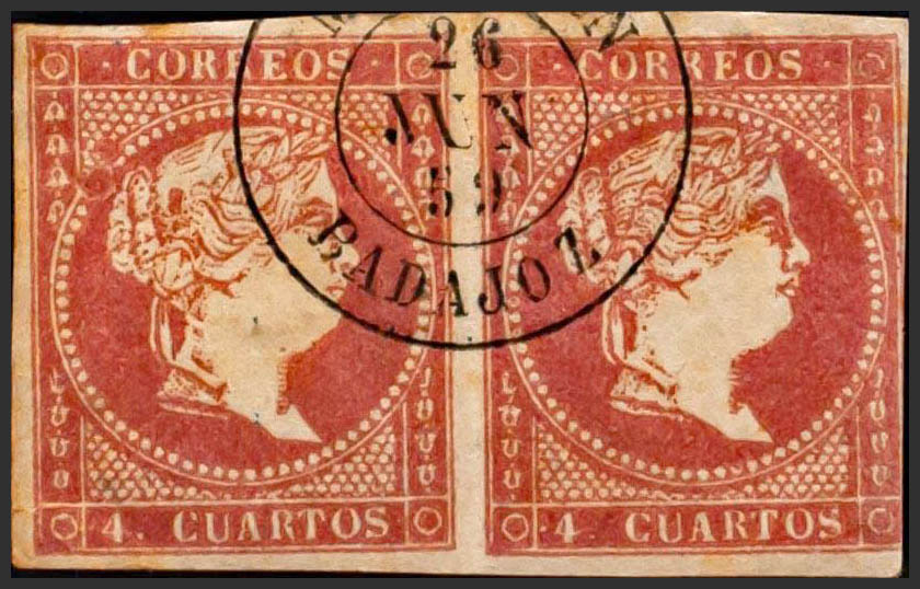 48(2). (1855ca). 4 red cuartos , pair. Postmark MEDELLIN / BADAJOZ. PRETTY.