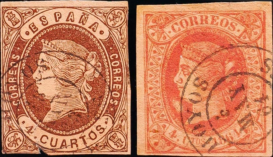 58, 64. (1862ca). Set of two stamps of 4 cuartos brown and 4 cuartos pink, unused with HOYOS / CACERES postmark. MAGNIFICENT AND RARE.