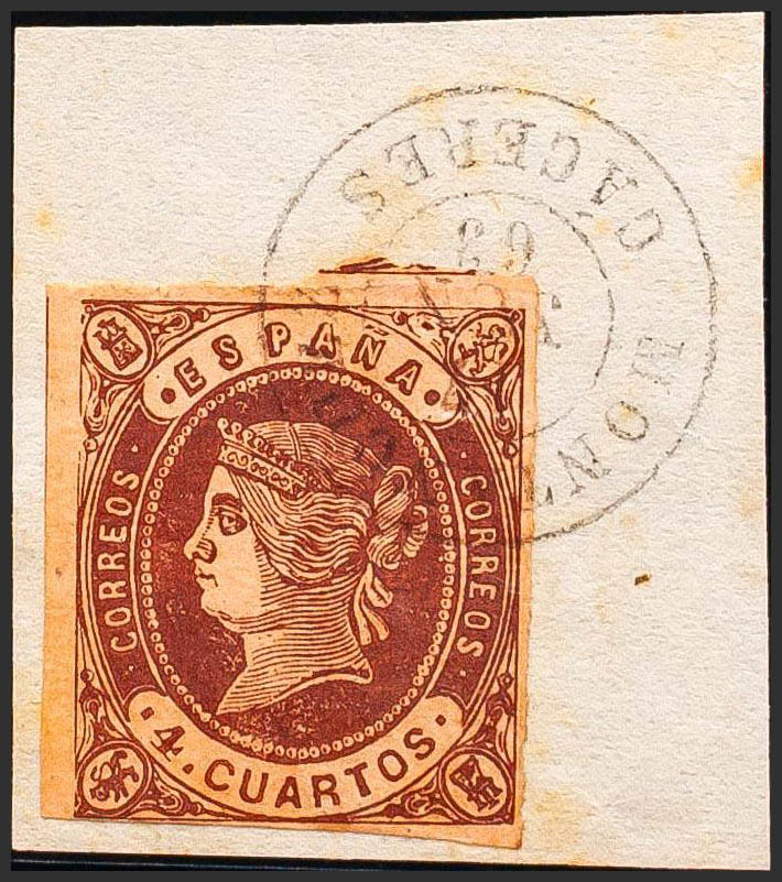 △ 58. 1862. 4 chestnut cuartos , on fragment. Postmark MONTANCHEZ / CACERES. MAGNIFICENT AND RARE.