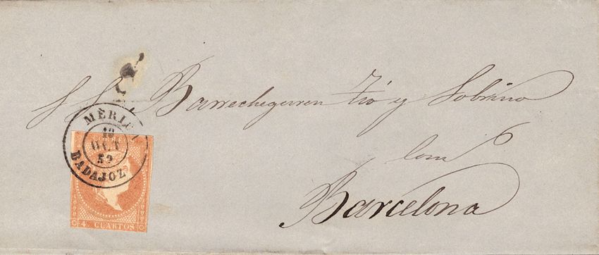 48. 1856. 4 red cuartos . MERIDA to BARCELONA. Postmark MERIDA / BADAJOZ. PRETTY.