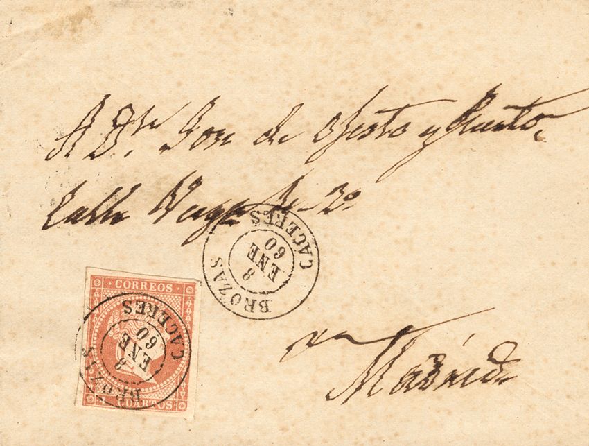 48. 1856. 4 red cuartos . Front of BROZAS to MADRID. Postmark BROZAS / CACERES. MAGNIFICENT.