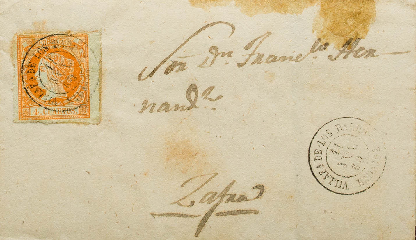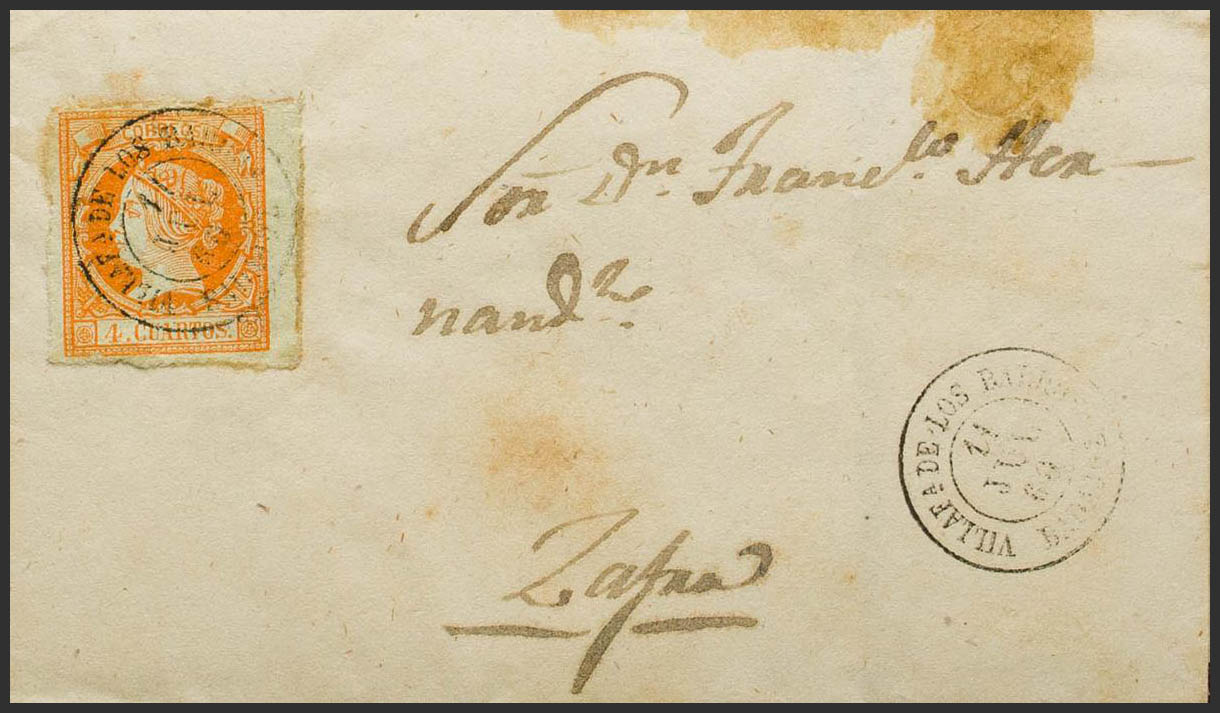 52. 1860. 4 orange cuartos , leaf edge. VILLAFRANCA DE LOS BARROS to ZAFRA. Postmark VILLAFª DE LOS BARROS / BADAJOZ. MAGNIFICENT.