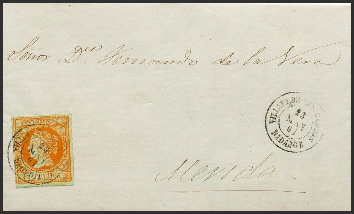 52. 1861. 4 orange cuartos . VILLAFRANCA DE LOS BARROS to MERIDA. Postmark VILLAFª DE LOS BARROS / BADAJOZ. MAGNIFICENT.
