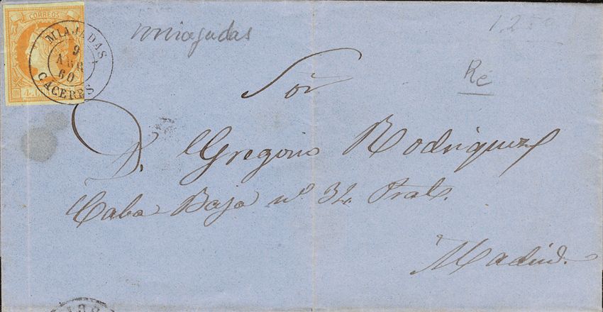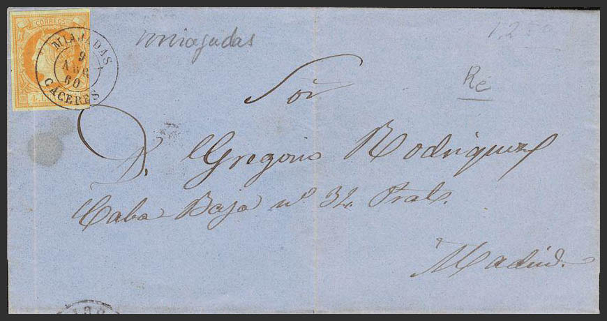 52. 1860. 4 cuartos yellow. MIAJADAS to MADRID. Postmark MIAJADAS / CACERES. MAGNIFICENT.