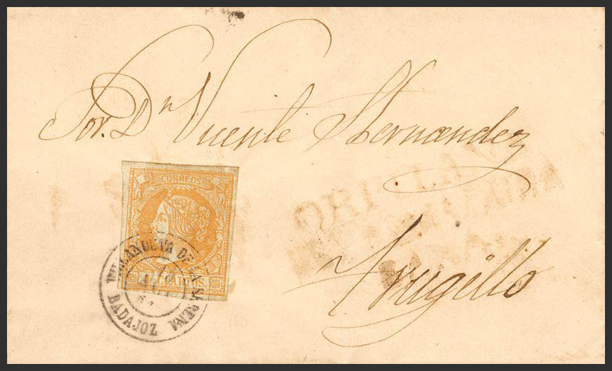 52. 1861. 4 cuartos yellow. VILLANUEVA to TRUJILLO. Postmark VILLANUEVA DE LA SERENA / BADAJOZ, next to the mark ORELLANA / ESTREMADURA / BAXA. PRETTY.
